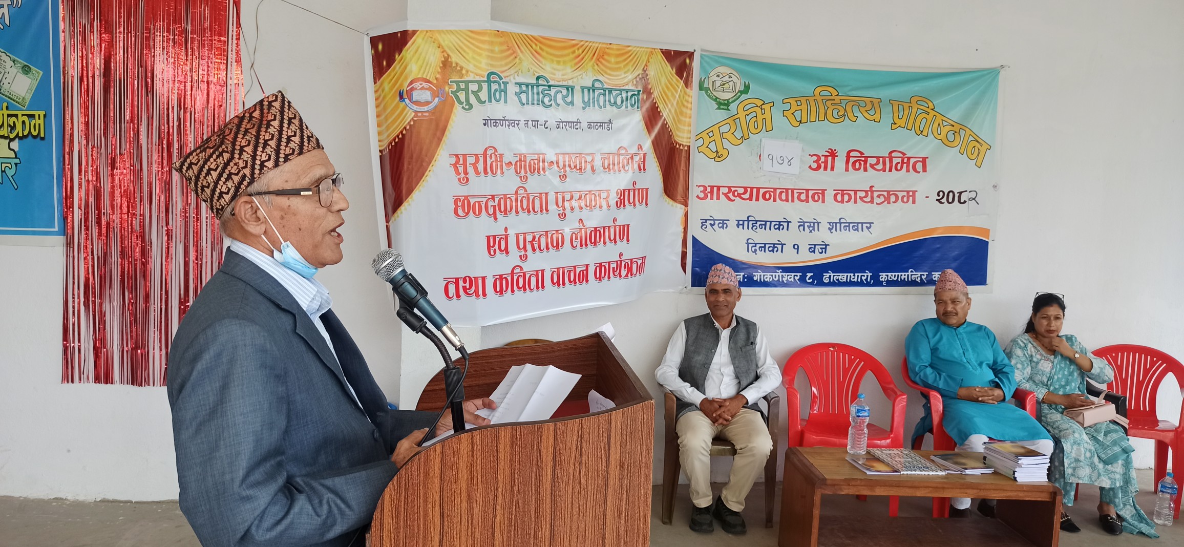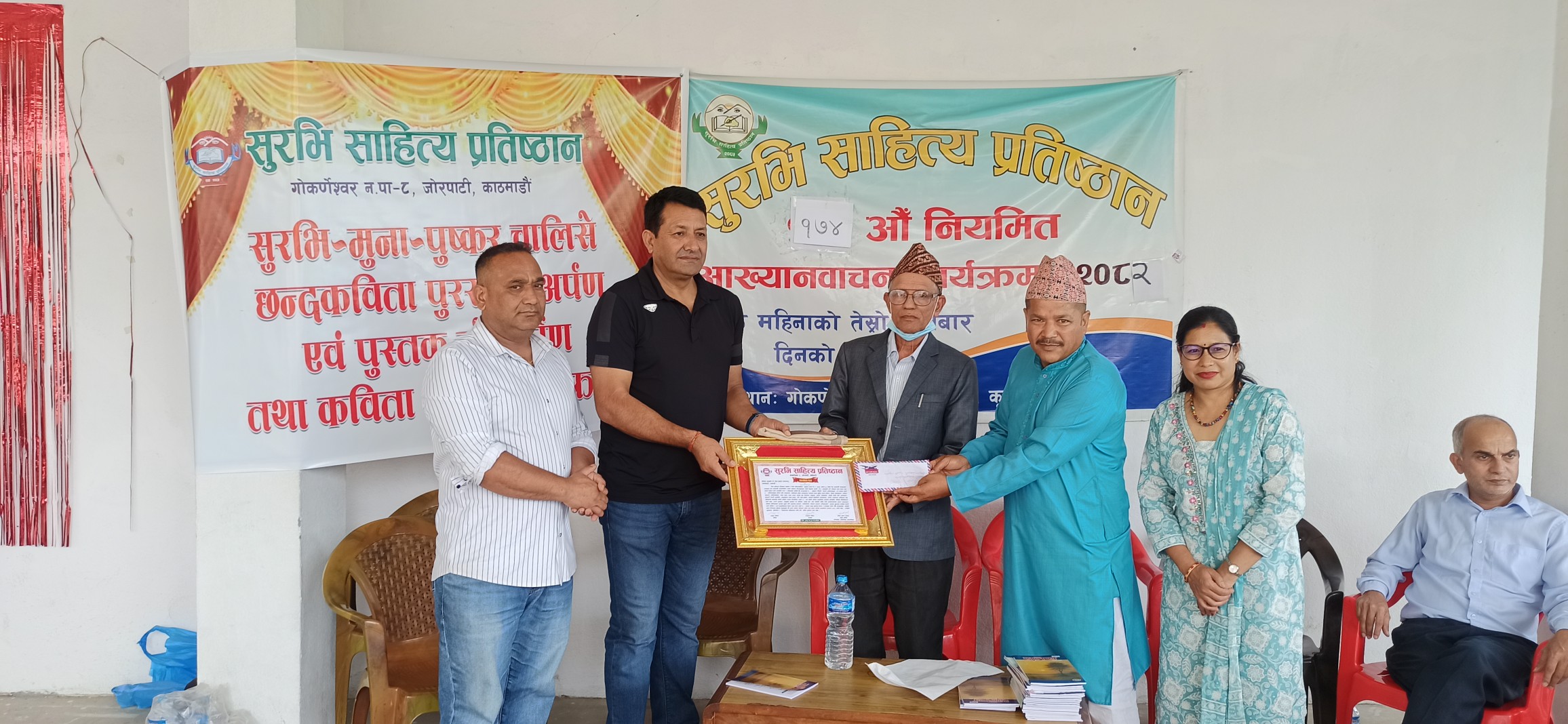 दिउँसो ११:३० बजेबाट सुरु भएको यो कार्यक्रममा विशेष कविता वाचन, पुरस्कार अर्पण र प्रतिष्ठानका अध्यक्ष बाजुराम पौडेलको खण्डकाव्य सुनटिकी लोकार्पण भएको थियो । पुस्तक लोकार्पणपछि प्रमुख अतिथि दीपककुमार रिसालले यस गोकर्णेश्वर नगरपालिका क्षेत्रलाई साहित्यिक नगर बनाउन सुरभि साहित्य प्रतिष्ठान र अभिनव साहित्य समाजले धेरै ठुलो भूमिका खेलेको कुरा बताउनुभयो । यसका लागि नगरपालिकाले पनि अन्तरविद्यालय साहित्यिक प्रतियोगिता गराई भावी साहित्यिक प्रतिभा तयार पार्न पहल गर्ने कुरा बताउनुभयो । साथै पुरस्कार संस्थापक चालिसे पतिपत्नीलाई बधाई पनि दिनुभयो । विशिष्ट अतिथि नन्दलाल श्रेष्ठले साहित्यलाई सबैले माथि उठाउनुपर्छ । यस्ता कर्ममा लाग्नुभएका सबैलाई बधाई तथा शुभकामना दिँदै यस नगरपालिका र वडा कार्यालयले प्रतिष्ठानलाई सकेसम्म सहयोग गर्ने वचन पनि दिनुभयो ।